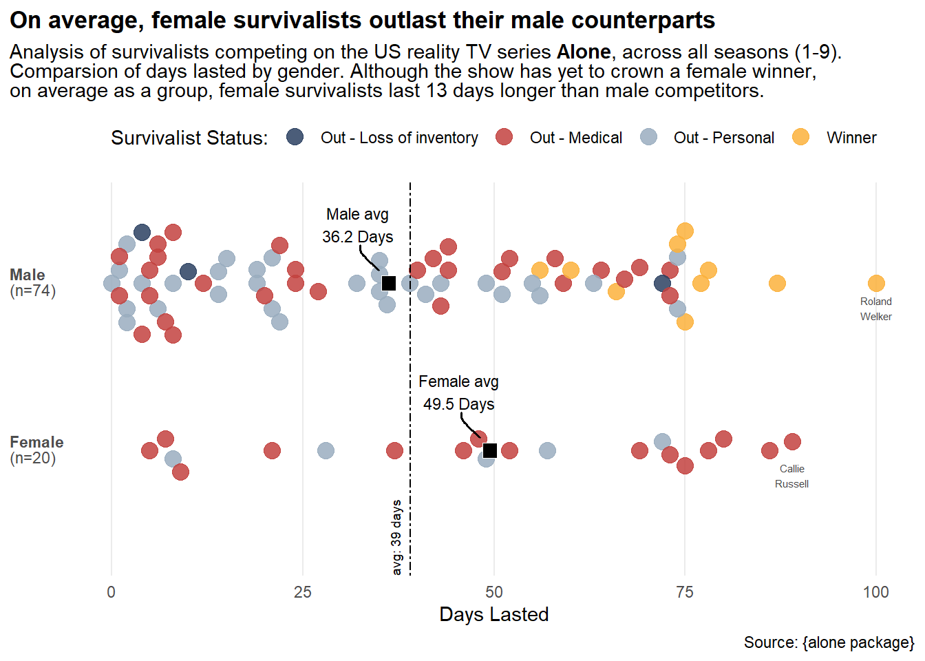 The next visualisation is from a tweet by Tanya Saphiro. To help with the making of the graph, I created two dataframes for the average numbers of survival period and the name of the winners for each gender. I also specified a variable to store the mean of all participants survival days. For representational purposes, the reason players tapped out of the game in the variable reason_category is modified in accord with the original graph.