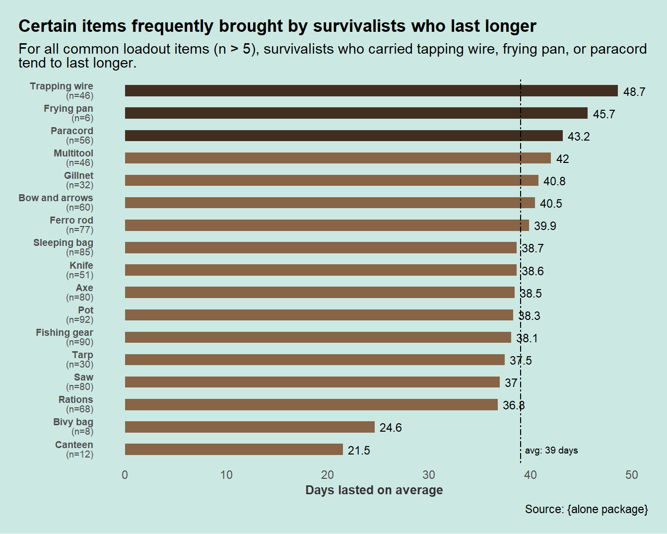 item = forcats::fct_reorder(item, days_lasted))I used a simple bar chart where the values are sorted based on frequency. The x-axis demonstrates the average surviving days of the participants. The top three items are tapping wire, frying pan, and paracord.