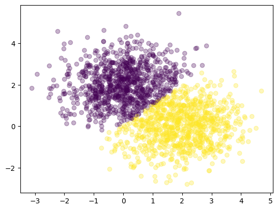 plt.scatter(X_test[:, 0], X_test[:, 1], c = y_pred[:, 0] > .5, alpha = .3)